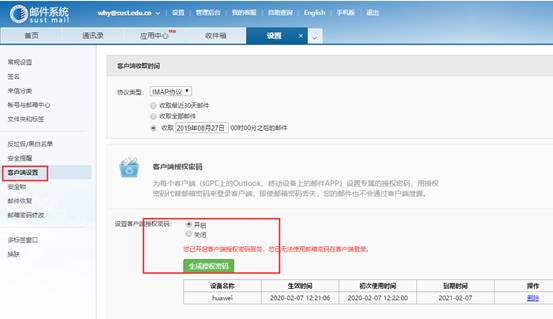 如果有用户使用电脑或者手机app的客户端收取邮件,可以打开【客户端授权】的功能,打开方法如图5所示。用生成的授权码代替邮箱密码完成客户端设置。
