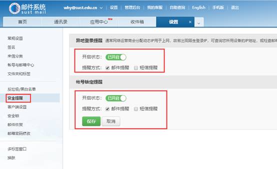 邮箱主界面,点击【设置】中的【邮箱设置】,左侧标签栏,选择【异地登录提醒】,把【异地登录提醒】和【账户锁定提醒】两个开启状态的标签开启。每次有异常登录都会收到邮件通知和短信提醒。