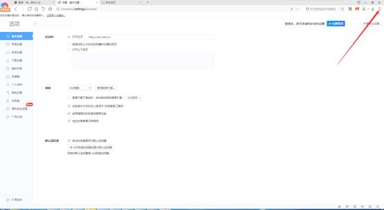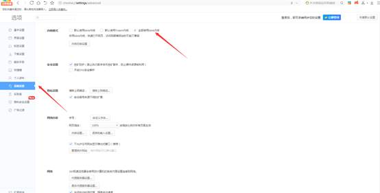 2.在弹出页面选择高级设置,在内核模式处勾选全部使用blink内核,并点击内核切换按钮