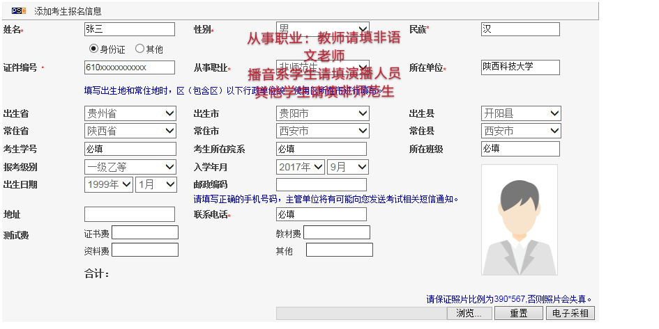1.考生报名时必须准确提供姓名、身份证号、性别、民族、所在单位、职业、联系电话及电子照片。