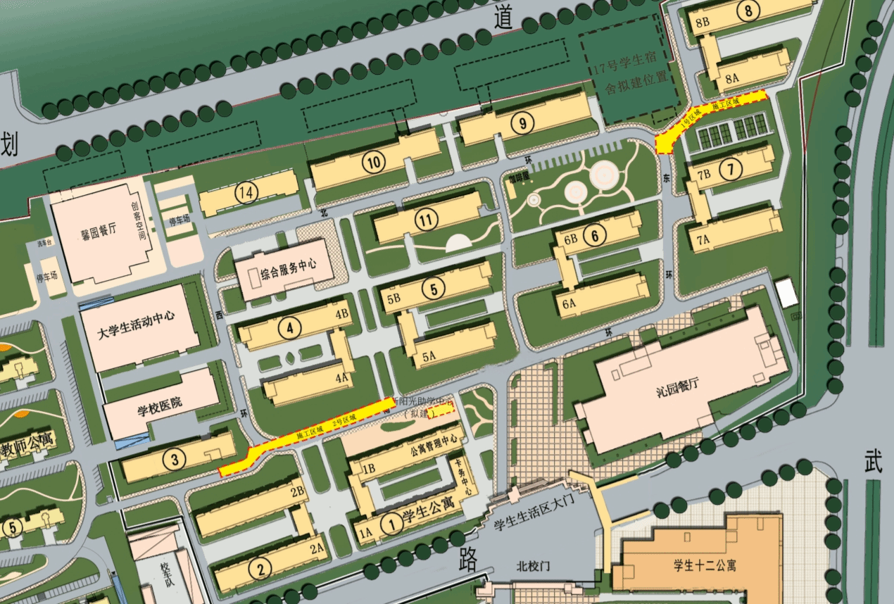 2号区域为学生1公寓及学生2公寓北侧道路封闭一半,封闭道路北测,封闭施工时间为10月16日上午7:00,解除封闭时间为10月30日下午5:00。
