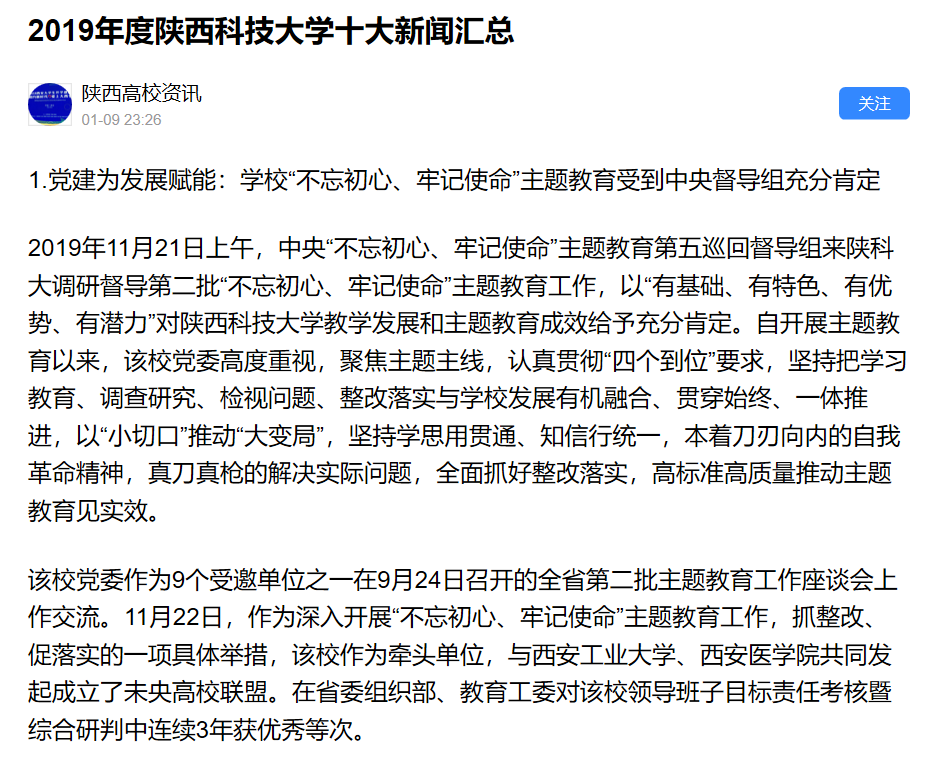 学校党委作为9个受邀单位之一在9月24日召开的全省第二批主题教育工作座谈会上作交流。11月22日,作为深入开展“不忘初心、牢记使命”主题教育工作,抓整改、促落实的一项具体举措,学校作为牵头单位,与西安工业大学、西安医学院共同发起成立了未央高校联盟。