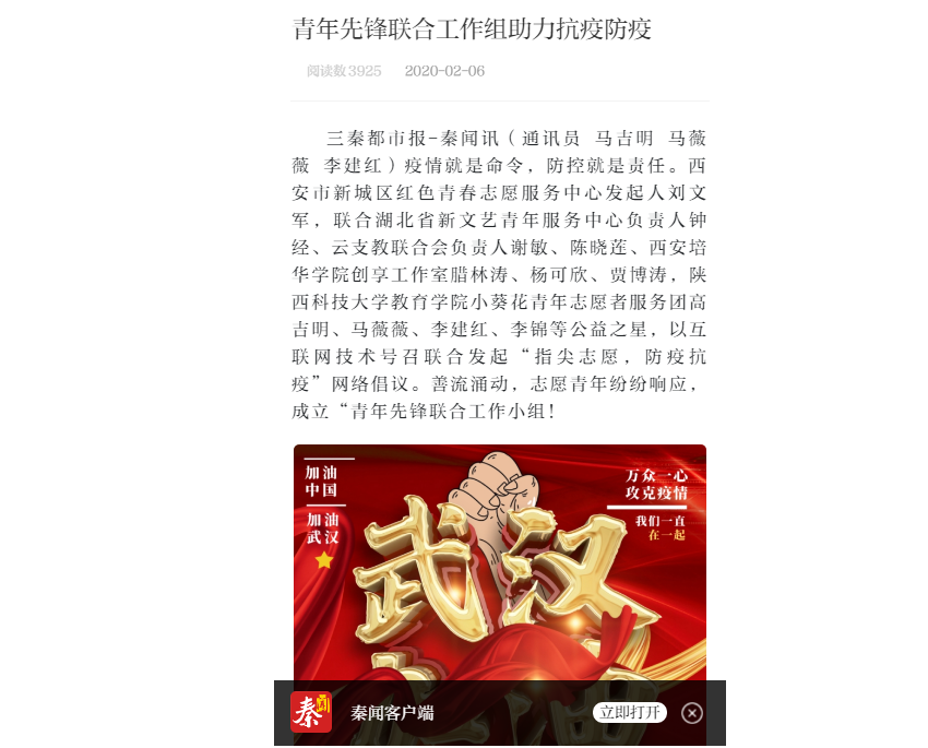 近日,《三秦都市报》APP报道德赢官网年志愿者等成立青年先锋联合工作组助力抗疫防疫。