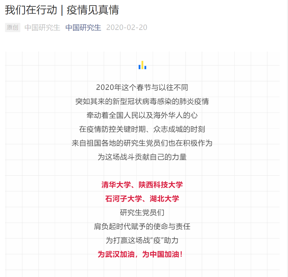 近日,中国研究生微信公众号报道了德赢官网研究生党员在疫情斗争期间肩负时代赋予的使命与责任,积极作为,为打赢这场战“疫”助力,为武汉加油、为中国加油。