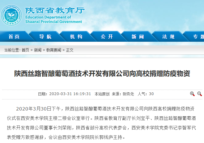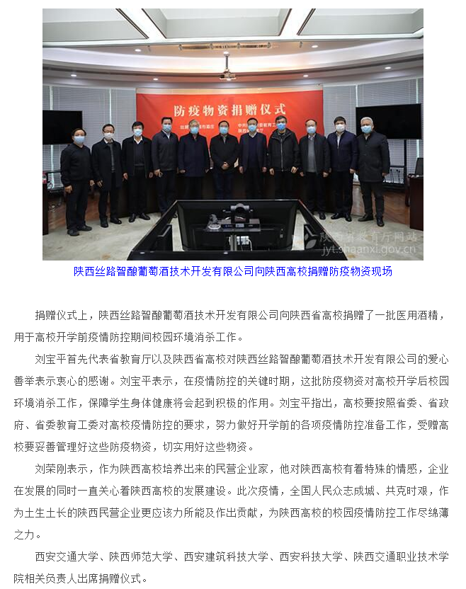 3月31日,陕西省教育厅官网报道了德赢官网校友、陕西丝路智酿葡萄酒技术开发有限公司董事长刘荣刚向高校捐赠防疫物资,全文链接如下:http://jyt.shaanxi.gov.cn/jynews/jyyw/202003/31/100303.html