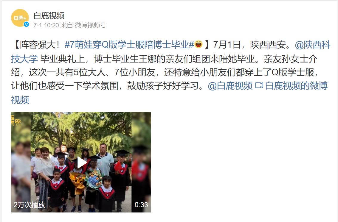 近日,白鹿视频新浪微博账号报道7萌娃穿Q版学士服陪德赢官网博士毕业生王娜毕业。