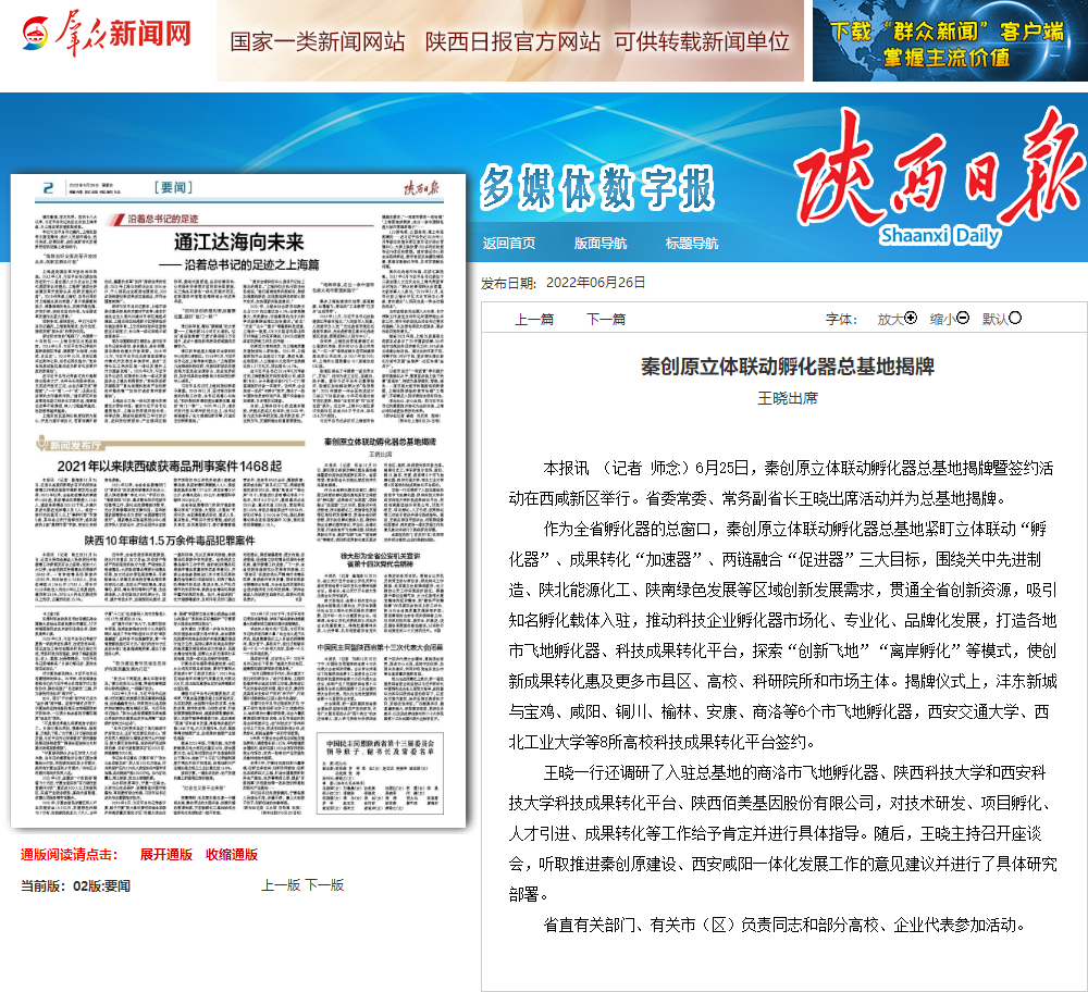 《陕西日报》:秦创原立体联动孵化器总基地揭牌