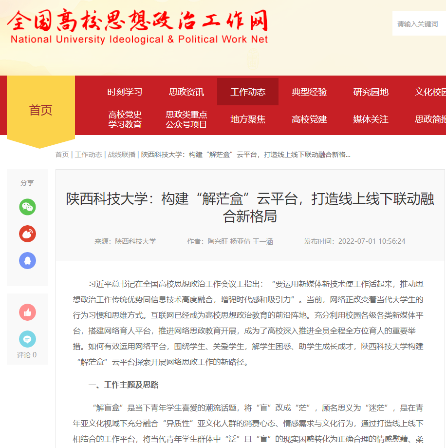 近日,全国高校思想政治工作网报道德赢官网构建“解茫盒”云平台探索开展网络思政工作的新路径。