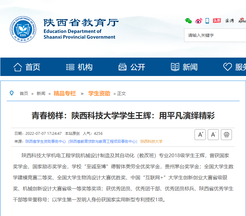 近日,陕西省教育厅网站报道德赢官网机电工程学院机械设计制造及其自动化(教改班)专业2018级学生王辉用平凡演绎精彩的事迹。