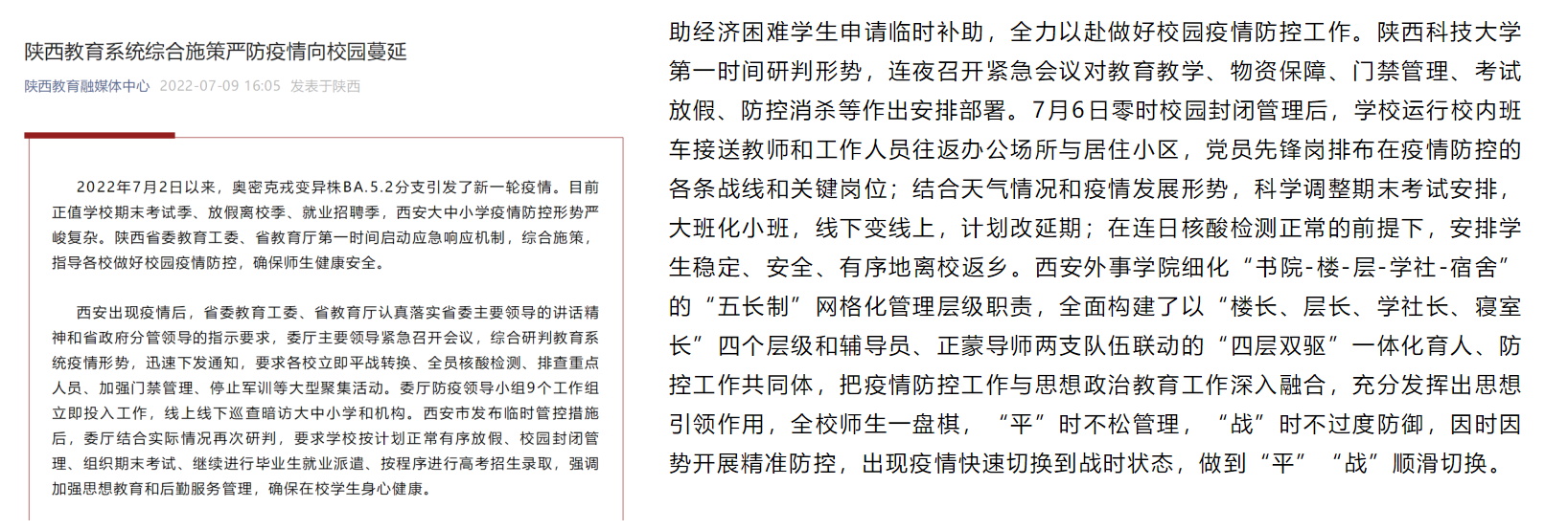 近日,陕西省教育厅网站、《陕西日报》、陕西教育融媒体中心等媒体纷纷报道,面对疫情,德赢官网第一时间研判形势,连夜召开紧急会议对教育教学、物资保障、门禁管理、考试放假、防控消杀等作出安排部署。7月6日零时校园封闭管理后,学校运行校内班车接送教师和工作人员往返办公场所与居住小区,党员先锋岗排布在疫情防控的各条战线和关键岗位;结合天气情况和疫情发展形势,科学调整期末考试安排,大班化小班,线下变线上,计划改延期;在连日核酸检测正常的前提下,安排学生安全、有序地离校返乡。