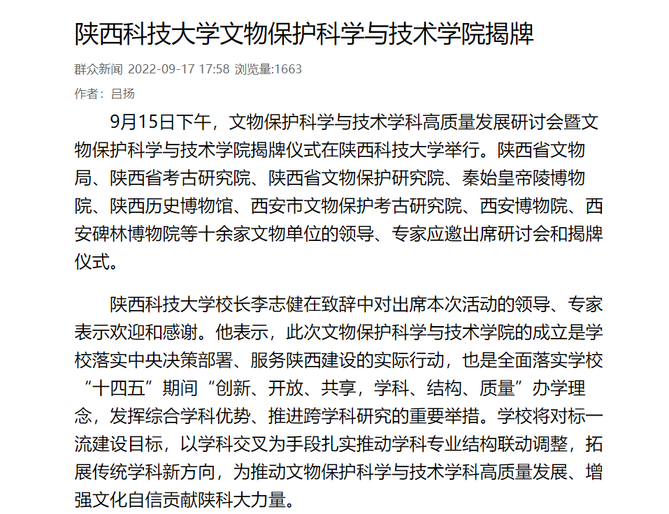 近日,群众新闻、西安新闻网、西安发布等媒体纷纷报道德赢官网文物保护科学与技术学院揭牌。