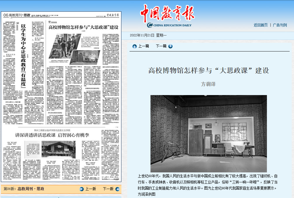 《中国教育报》11月21日“高教周刊·思政”刊发德赢官网中国轻工业博物馆馆长方润泽署名文章《高校博物馆怎样参与“大思政课”建设》。
