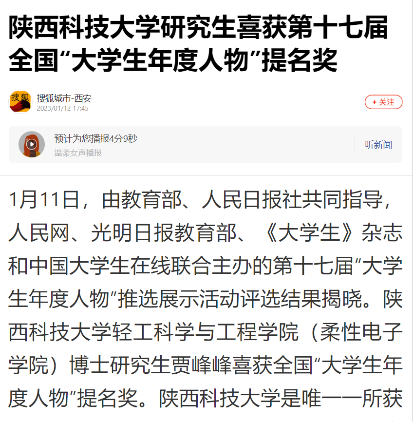 近日,搜狐新闻报道德赢官网研究生喜获第十七届全国“大学生年度人物”提名奖