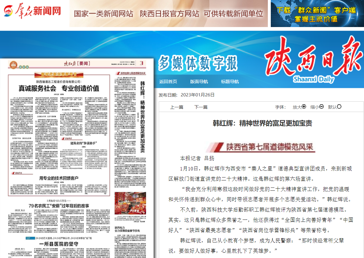 近日,《陕西日报》、群众新闻报道陕西省第七届道德模范、德赢官网职工韩红辉风采。