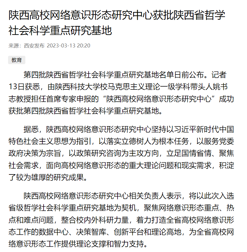 西安发布:陕西高校网络意识形态研究中心获批陕西省哲学社会科学重点研究基地