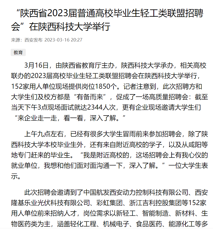 群众新闻:152家用人单位向陕西轻工类专业毕业生发“英雄帖”