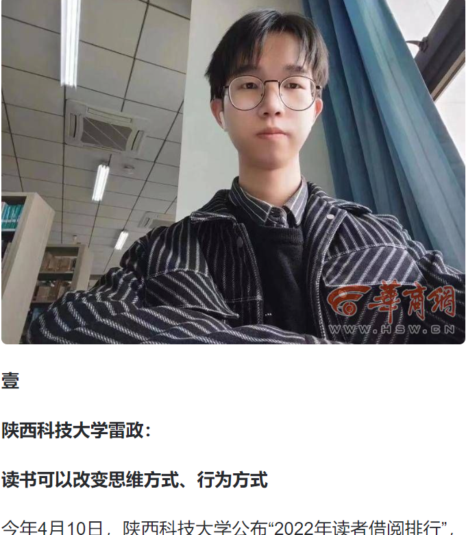 近日,华商头条、二三里资讯报道2022年位列德赢官网图书借阅榜首的雷政同学的阅读故事。