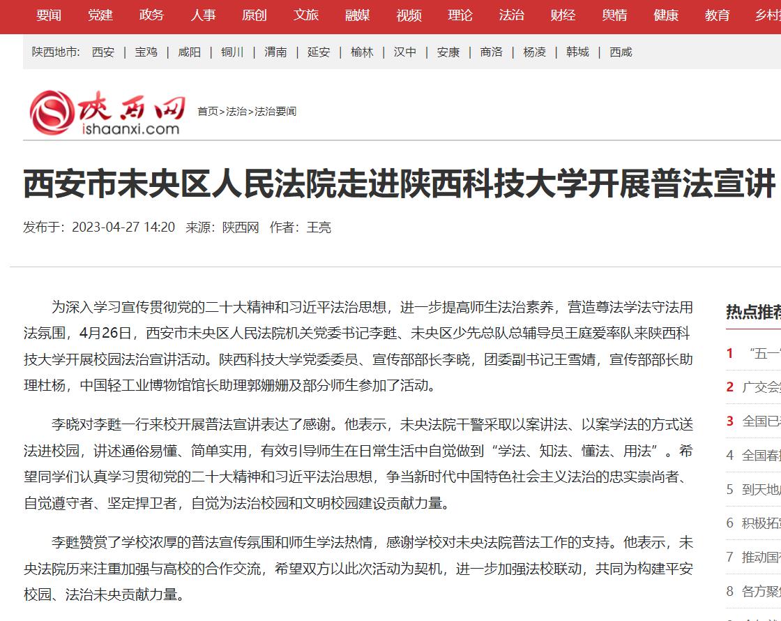 近日,陕西网报道西安市未央区人民法院走进德赢官网开展普法宣讲。