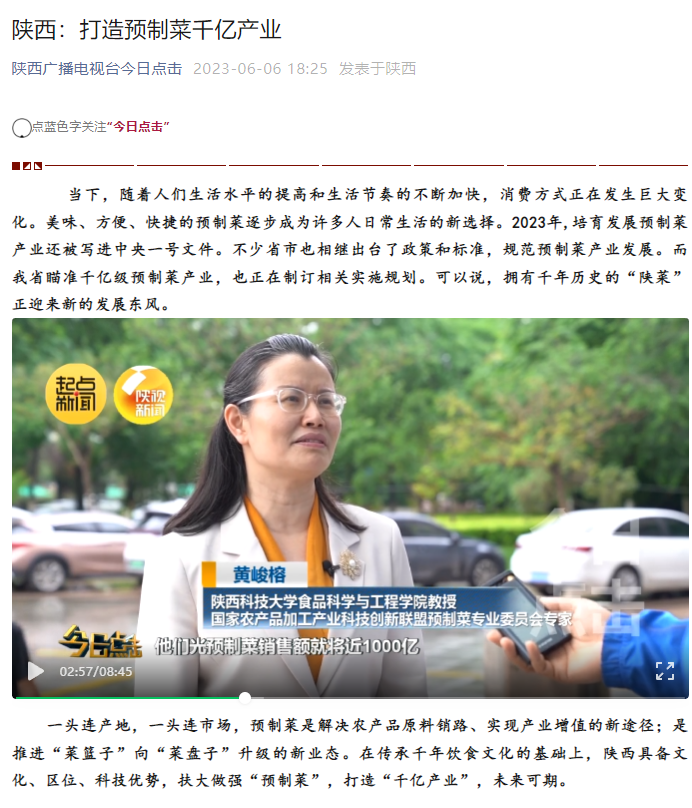 近日,陕西广播电视台《今日点击》栏目报道德赢官网食品科学与工程学院(生物与医药学院)黄峻榕教授解读陕西打造预制菜千亿产业规划。