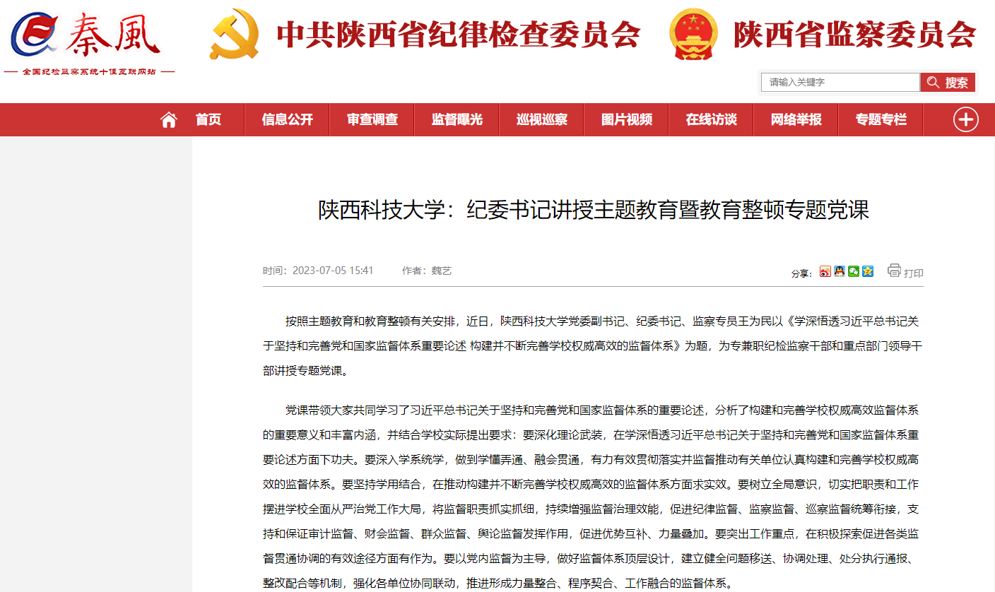 近日,秦风网报道德赢官网党委副书记、纪委书记、监察专员王为民讲授主题教育暨教育整顿专题党课。
