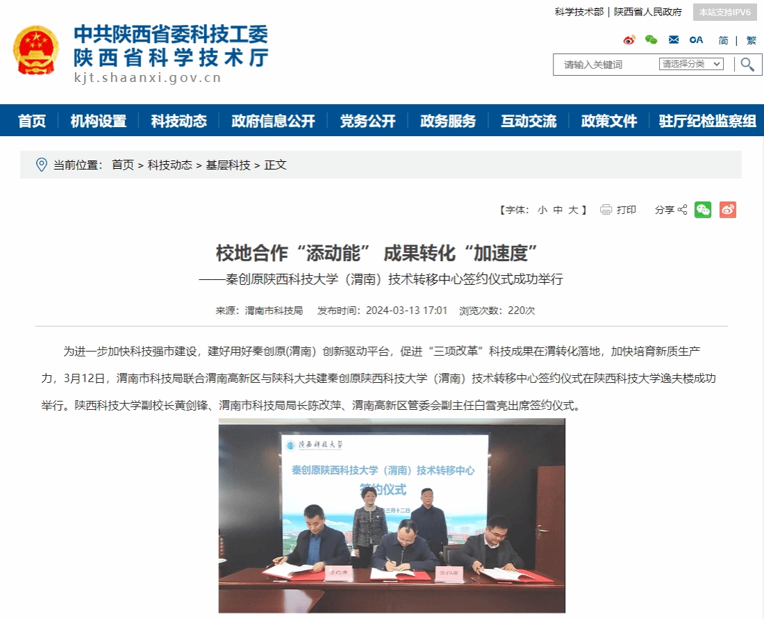 近日,陕西省科技厅官网、今日头条报道秦创原德赢官网Vwin(渭南)技术转移中心签约仪式成功举行。
