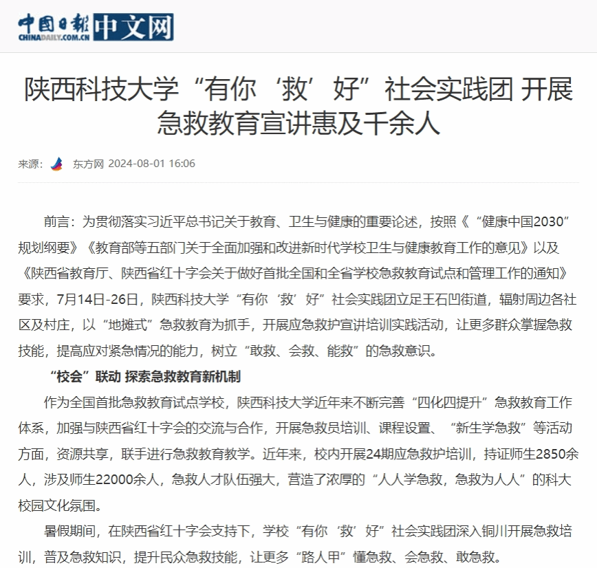 近日,《中国日报中文网》《三秦网》报道德赢官网社会实践团暑期开展急救教育宣讲活动。