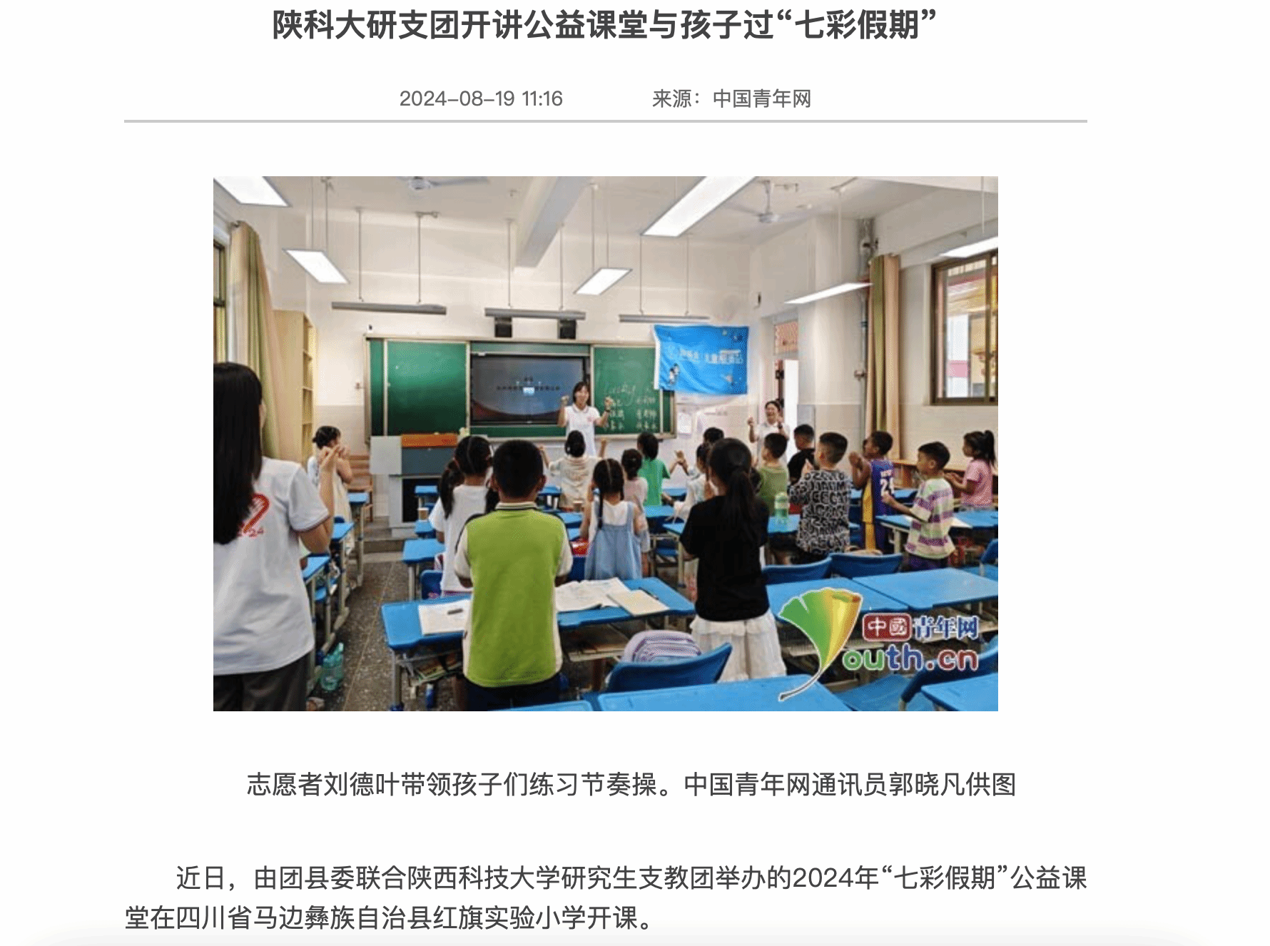 近日,《中国青年网》报道德赢官网研支团开讲公益课堂与孩子过“七彩假期”。