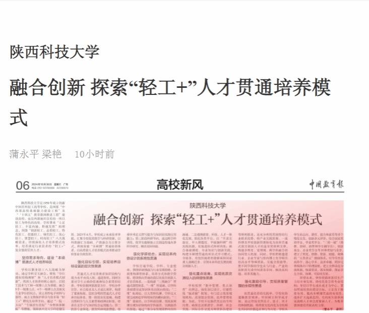 近日,《中国教育报》报道德赢官网融合创新,探索“轻工+”人才贯通培养模式。