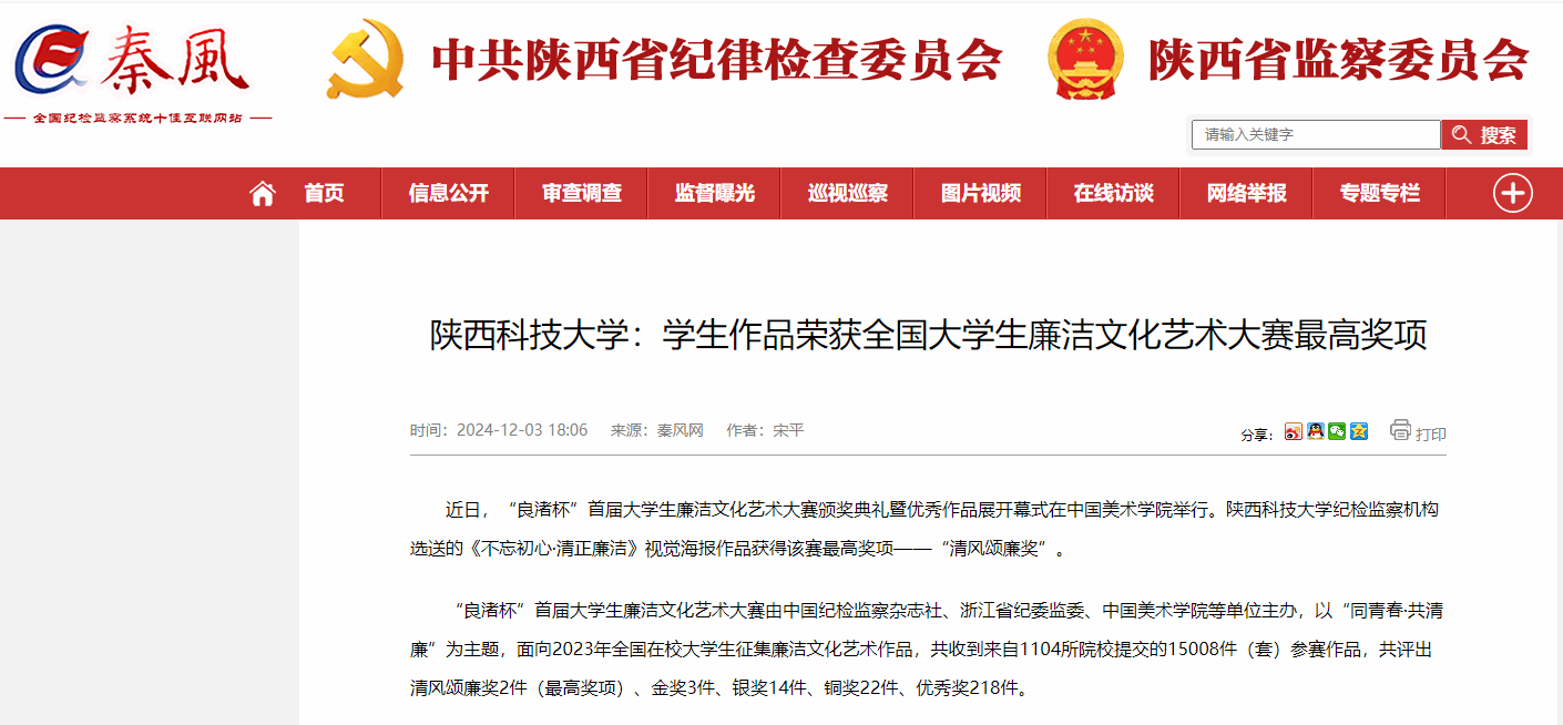 近日,秦风网报道德赢官网学生作品荣获全国大学生廉洁文化艺术大赛最高奖项。