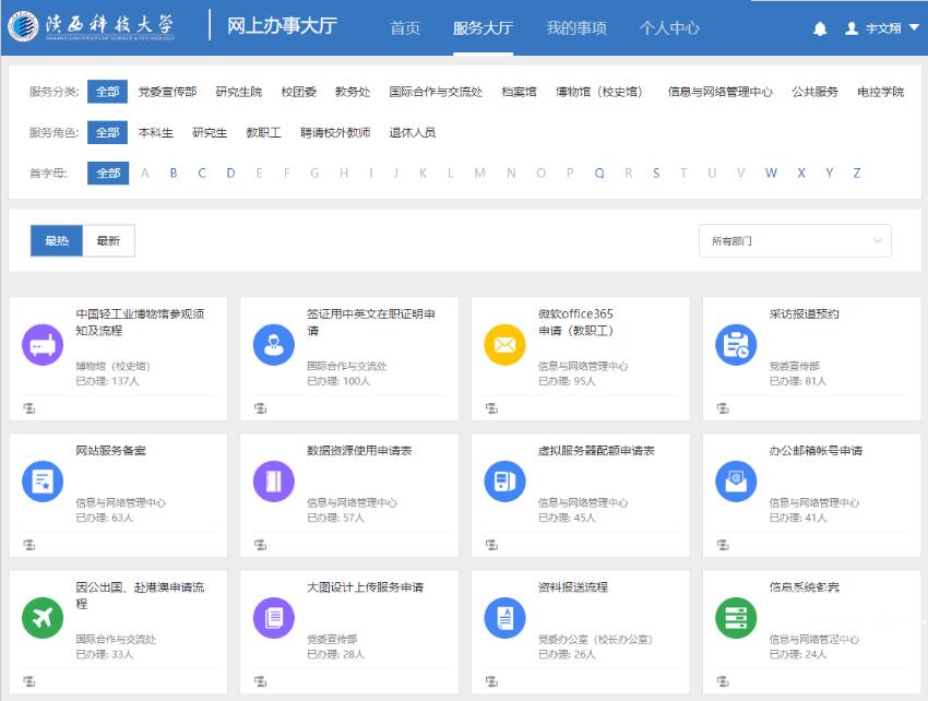 秉持“让信息多跑路,让师生少跑腿”原则,网络与管理中心在校园网推出“网上办事大厅”服务,一改拿着审批单到处找各部门签字的费时费力,师生只需在电脑或者手机上“点一点”,即刻发起办事流程,还能关注审批进度,随时随地“掌中”办事。经过与多个职能部门的反复沟通、制作、测试,“网上办事大厅”目前已建事项60余项,发布事项24项,涉及党委宣传部、校团委、研究生院、国际处、档案馆、中国轻工业博物馆等部门,包含采访报道预约、横幅悬挂申请、研究生寒暑假留校申请、博物馆参观预约、签证用中英文在职证明、校团委用印、档案查阅、专利证书领用、站群子站申请、学生邮箱激活等事项的申请和审批流程。过去往往需要跑一天才能完结的事务,在“网上办事大厅”最快几分钟就能能得到解决。截至目前,服务次数共计8107次,服务人数达3464人。