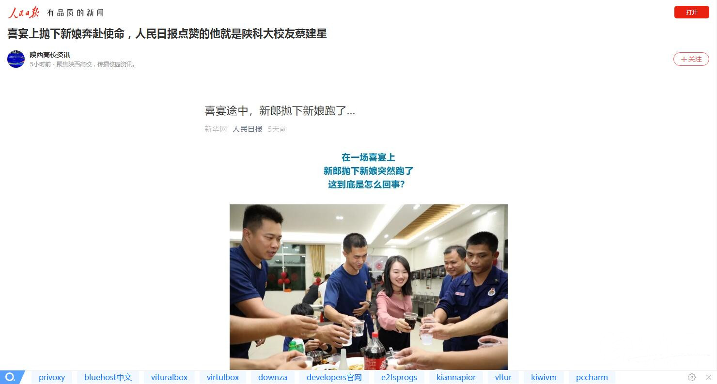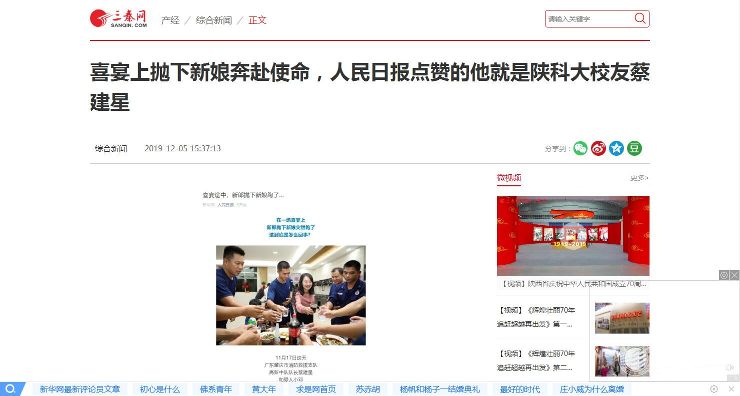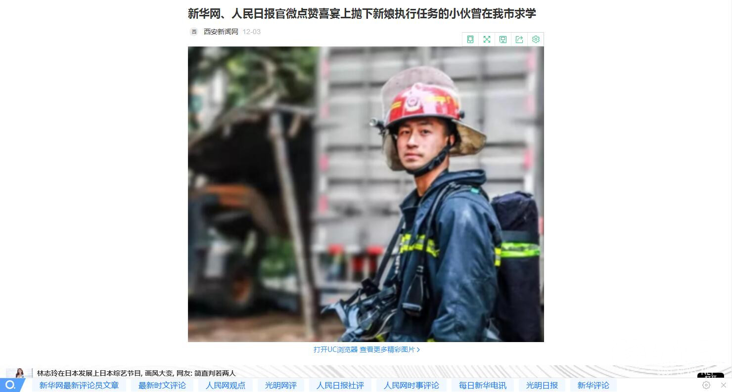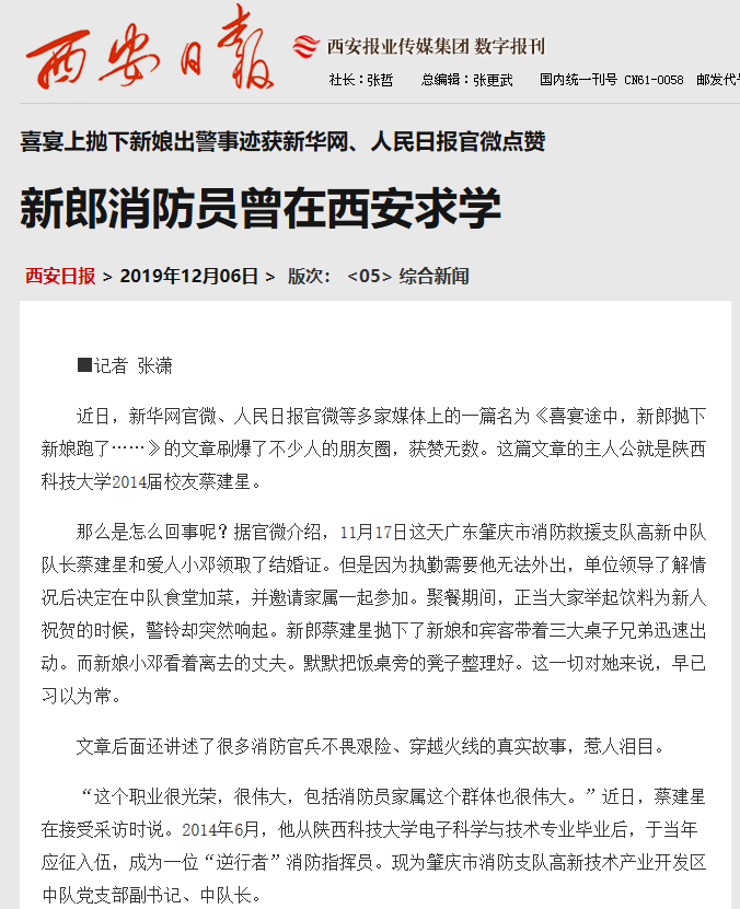 西安日报:喜宴上抛下新娘出警事迹获新华网、人民日报官微点赞 新郎消防员曾在西安求学