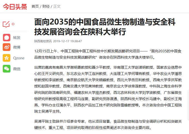 今日头条:面向2035的中国食品微生物制造与安全科技发展咨询会在陕科大举行
