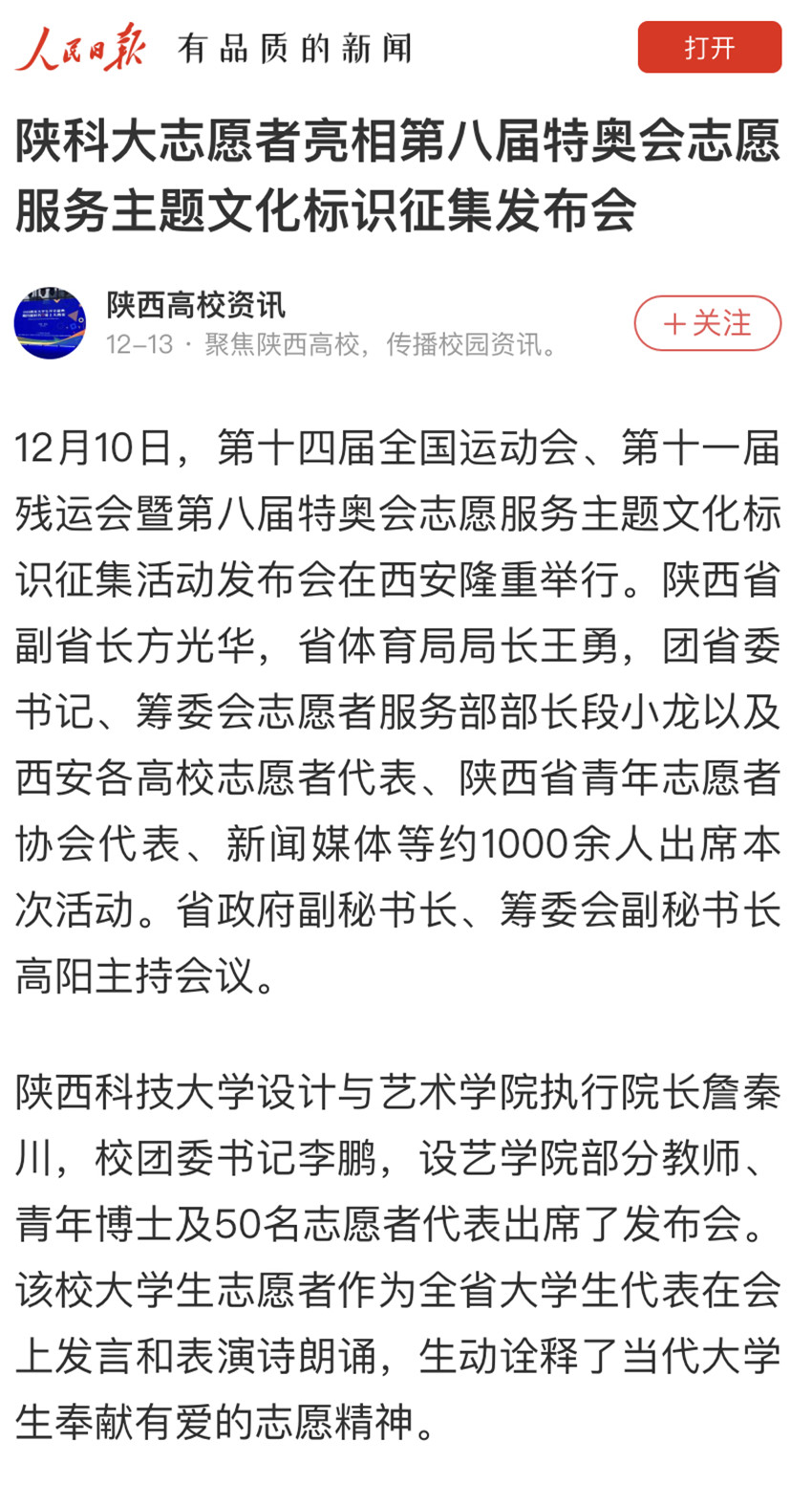 人民日报APP:陕科大志愿者亮相第八届特奥会志愿服务主题文化标识征集发布会