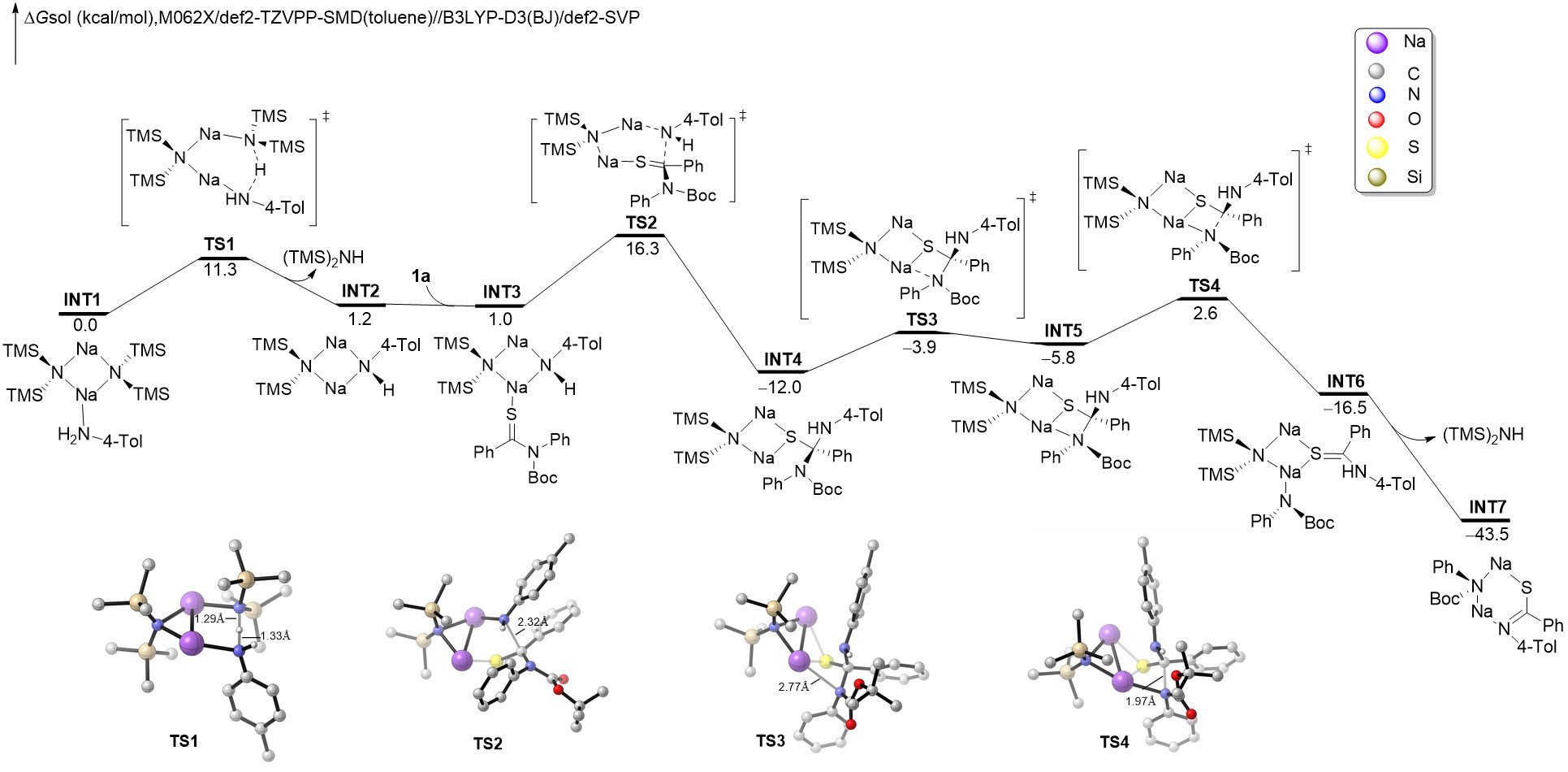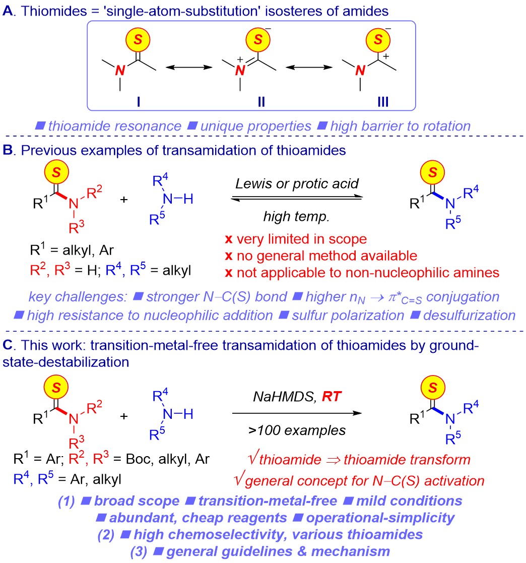 “Chemoselective Transamidation of Thioamides by Transition-Metal-Free N–C(S) Transacylation”首次提出了硫代酰胺的“基态去稳定化”(ground-state-destabilization)策略,实现了在药学、生物学领域有着广泛应用的硫代酰胺的转胺化反应。该方法不仅避免了毒性过渡金属催化剂的使用,而且有着广泛的底物适用范围(>100个底物)。为了进一步厘清硫代酰胺转胺化的反应机理,该论文还通过密度泛函理论对反应过程进行了探讨。