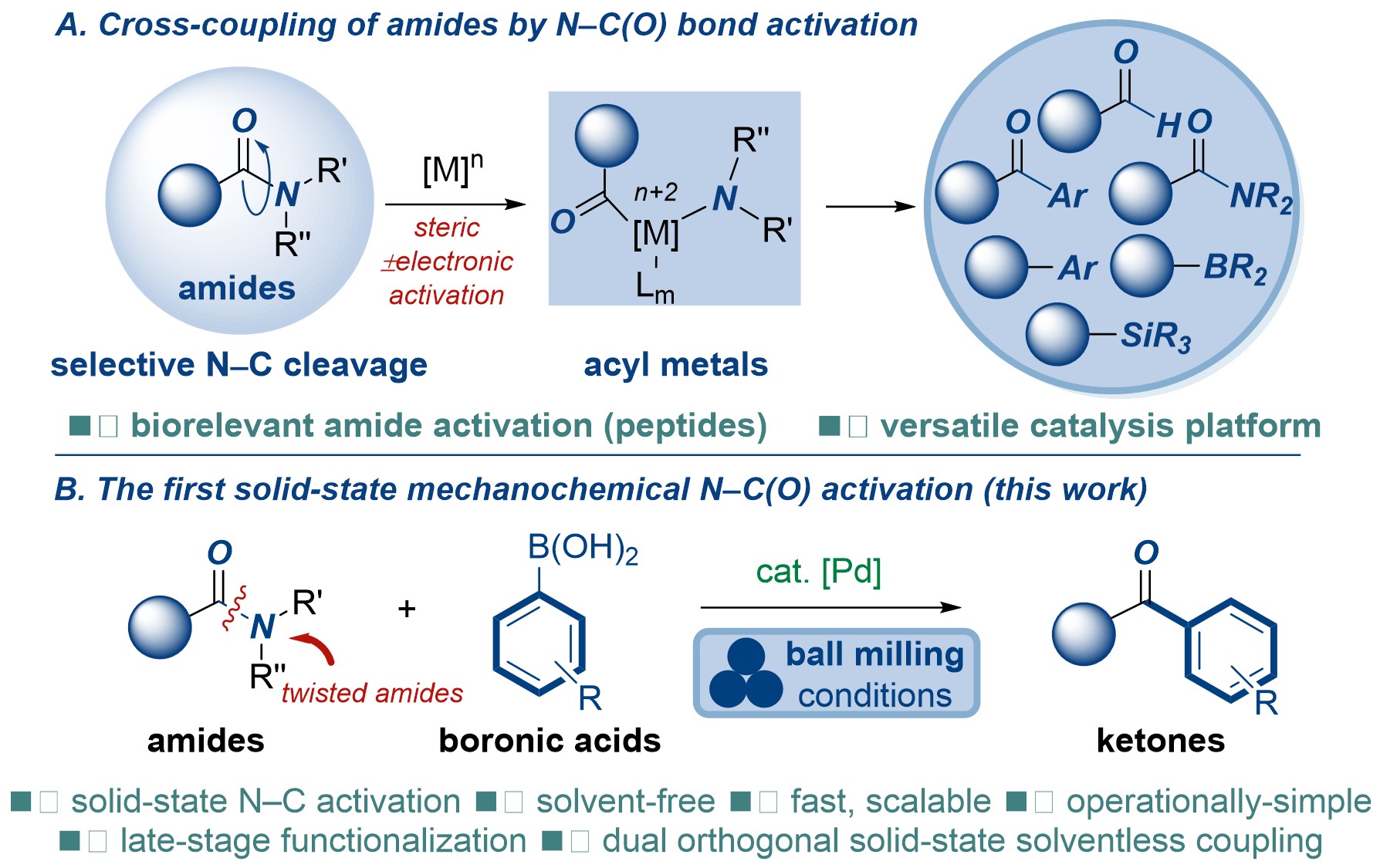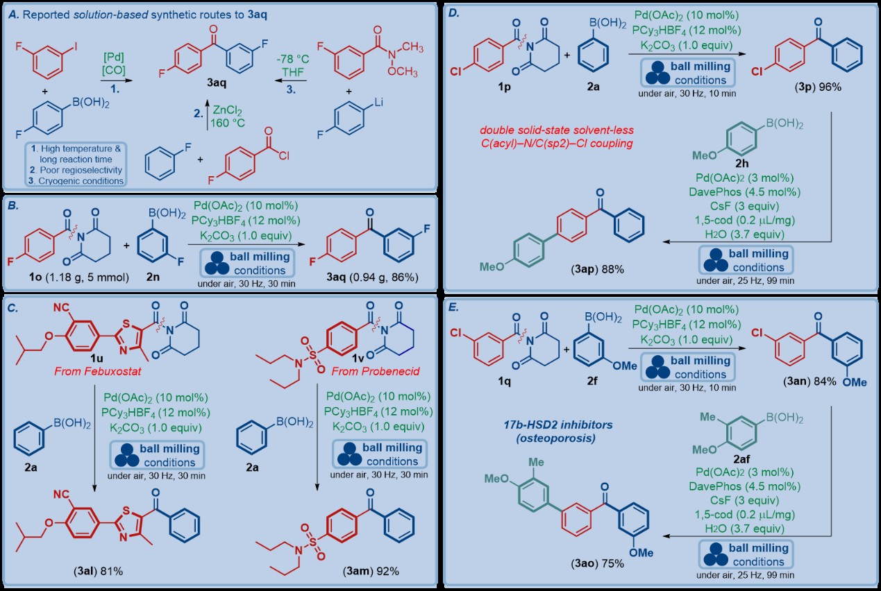 “Mechanochemical Solvent-Free Suzuki–Miyaura Cross-Coupling of Amides via Highly Chemoselective N–C Cleavage首次将机械化学方法应用于碳氮键选择性断裂的Suzuki-Miyaura交叉偶联反应。反应过程不需要任何有机溶剂与额外加热,后处理简单,反应高效,并可用于医药中间体的合成、复杂药物的后期修饰与机械化学条件下的串联偶联反应。本研究不仅丰富了酰胺键的活化反应研究,而且为有机合成化学中惰性化学键的活化反应提供了新思路。