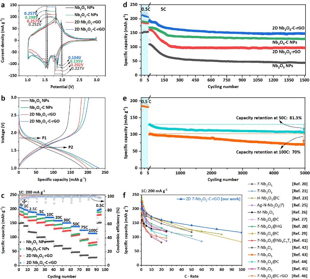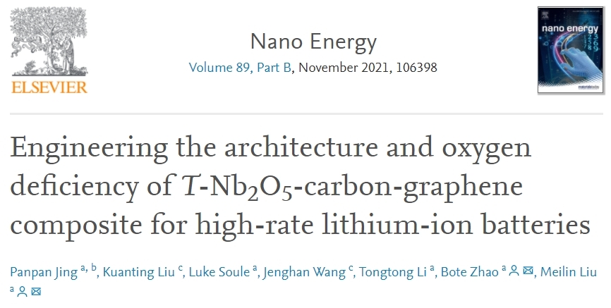 电动汽车(EV)的快速发展是当下地面交通运输领域变革的最显著标志。然而,人们在入手电动汽车时,优先考虑的是其“续航里程”“充电效率”和“功率输出”,而作为电动汽车的“心脏”,锂离子电池的性能无疑是影响电动汽车上述特性的最重要因素之一。为此,景盼盼博士等人基于晶格氧空位和2D层状结构,开发了具有超高倍率特性(a capacity of 114 mAh/g obtained at 100 C or 20 A/g)和超长循环稳定性(a capacity of 147 mAh/g obtained at 5C for 1,500 cycles and 107 mAh/g obtained at 50 C for 5,000 cycles)的T-Nb2O5-Carbon-Graphene锂离子电池负极材料,并揭示了T-Nb2O5的晶格氧空位能够有效提升整个复合材料的电子电导和锂离子的扩散动力学特性。此研究工作是景盼盼博士在美国佐治亚理工学院留学期间与Prof. Meilin Liu(Hightower Endowed Chair and Regents' Professor,H-index:135)和Dr. Bote Zhao(现为华南理工大学教授)共同合作完成。