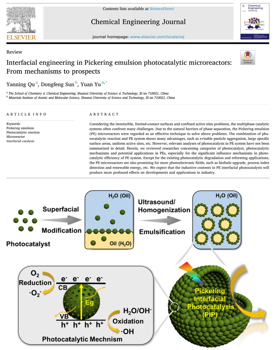 近日,化学与化工学院青年教师屈彦宁博士在著名化工期刊《Chemical Engineering Journal》(影响因子16.744)上发表文章“Interfacial engineering in Pickering emulsion photocatalytic microreactors: From mechanisms to prospects”。