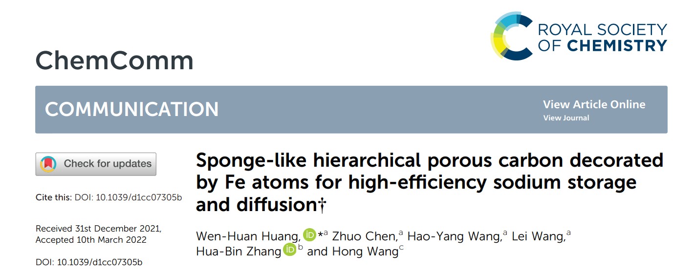 W. Huang*, Z. Chen, H. Wang, L. Wang, H. Zhang, and H. Wang, Sponge-like hierarchical porous carbon decorated by Fe atoms for high-efficient sodium storage and diffusion.Chemical Communications,2022, 58(28): 4496-4499.