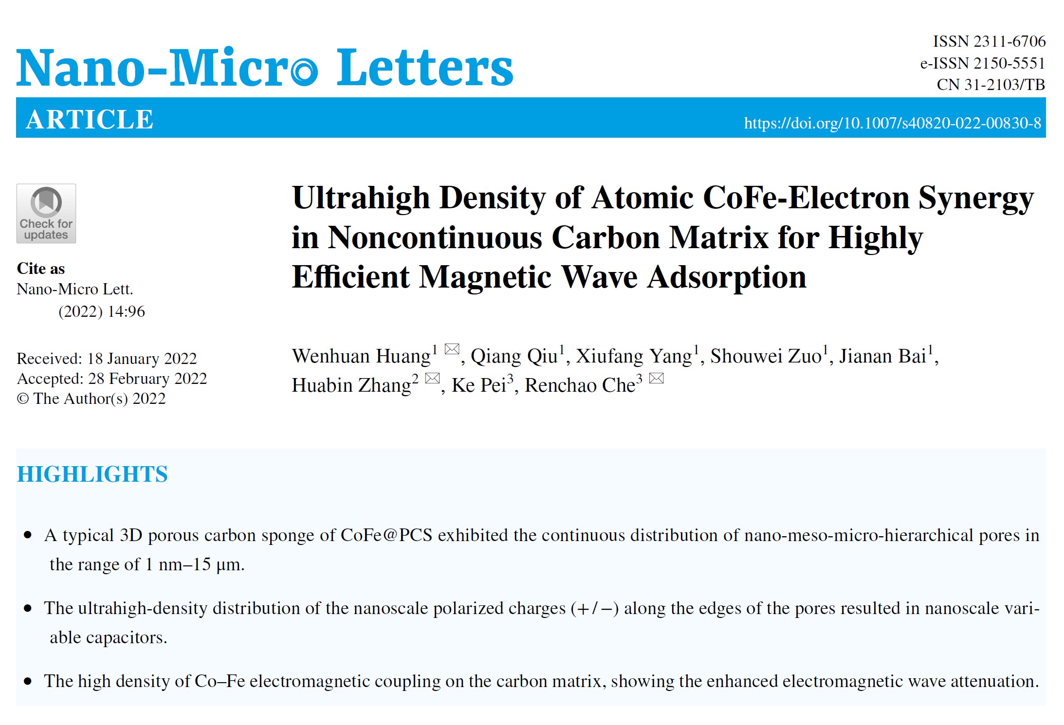 Wenhuan Huang*, Qiang Qiu, Xiufang Yang, Shouwei Zuo, Jianan Bai, Huabin Zhang*, Ke Pei and Renchao Che*. Ultrahigh Density of Atomic CoFe‑Electron Synergy in Noncontinuous Carbon Matrix for Highly Efficient Magnetic Wave Adsorption.Nano Micro-Letters,2022, 14, 96.