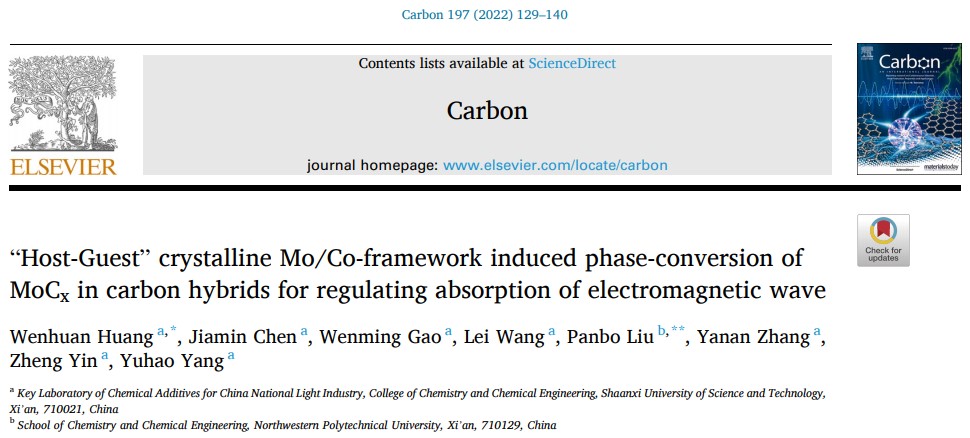 Wenhuan Huang*, Jiamin Chen, Wenming Gao, Lei Wang, Panbo Liu*, Yanan Zhang, Zheng Yin, Yuhao Yang,“Host-Guest” crystalline Mo/Co-framework induced phase-conversion of MoCx in carbon hybrids for regulating absorption of electromagnetic wave, Carbon 197 (2022) 129-140.