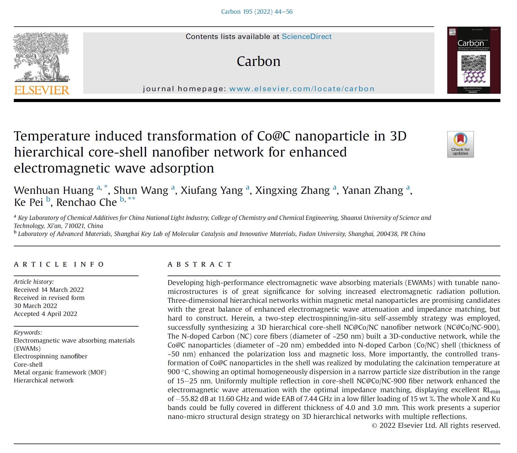 Wenhuan Huang*, Shun Wang, Xiufang Yang, Xingxing Zhang, Yanan Zhang, Ke Pei, Renchao Che*,Temperature induced transformation of Co@C nanoparticle in 3D hierarchical core shell nanofiber network for enhanced electromagnetic wave adsorption.Carbon,2022, 4, 195: 44-56.