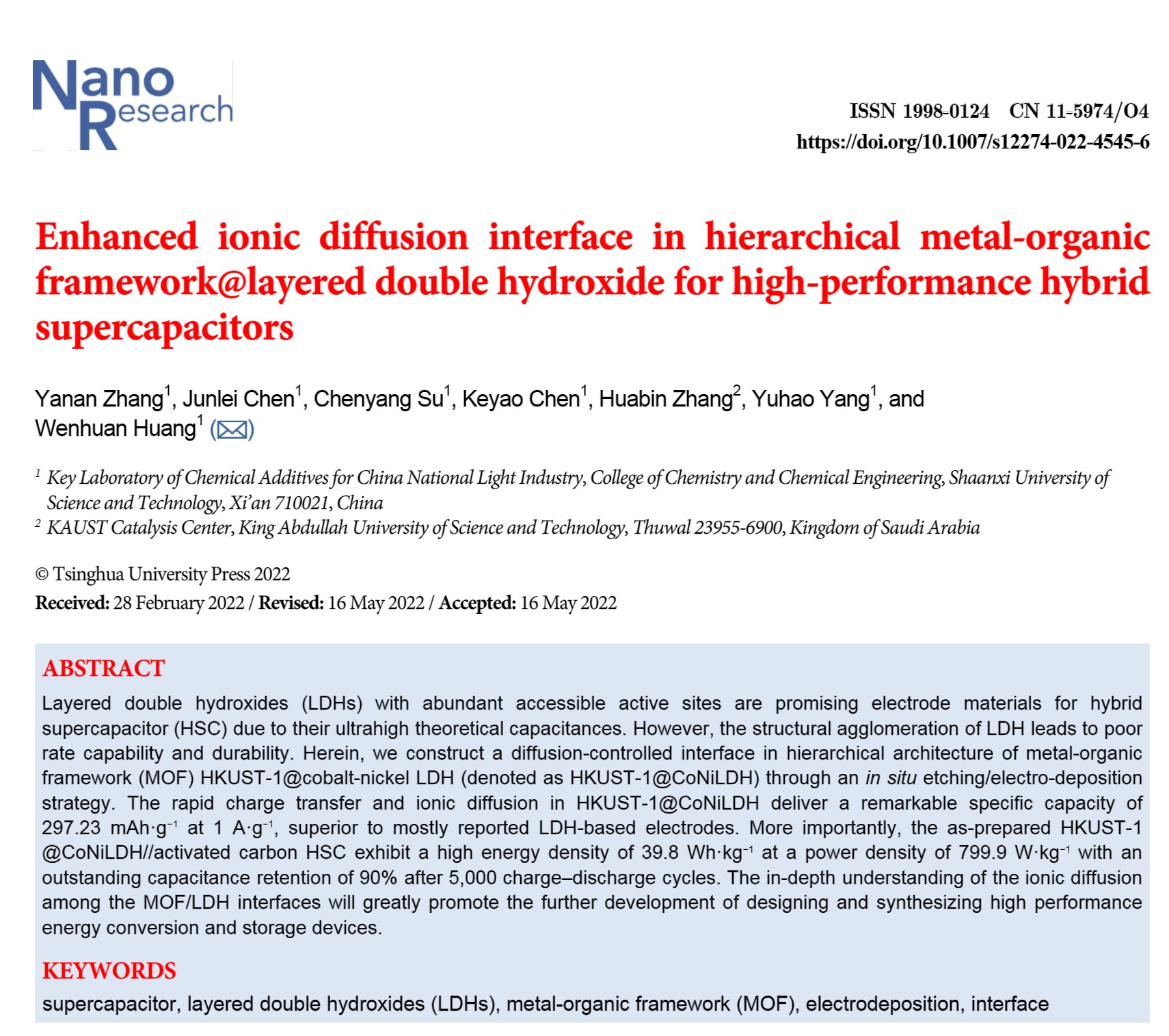Z. Yanan, C. Junlei, S. Chenyang, C. Keyao, Z. Huabin, Y. Yuhao, H. Wenhuan, Enhanced ionic diffusion interface in hierarchical metal-organic framework@layered double hydroxide for high-performance hybrid supercapacitors,Nano Research,2022, DOI: 10.1007/s12274-022-4545-6.