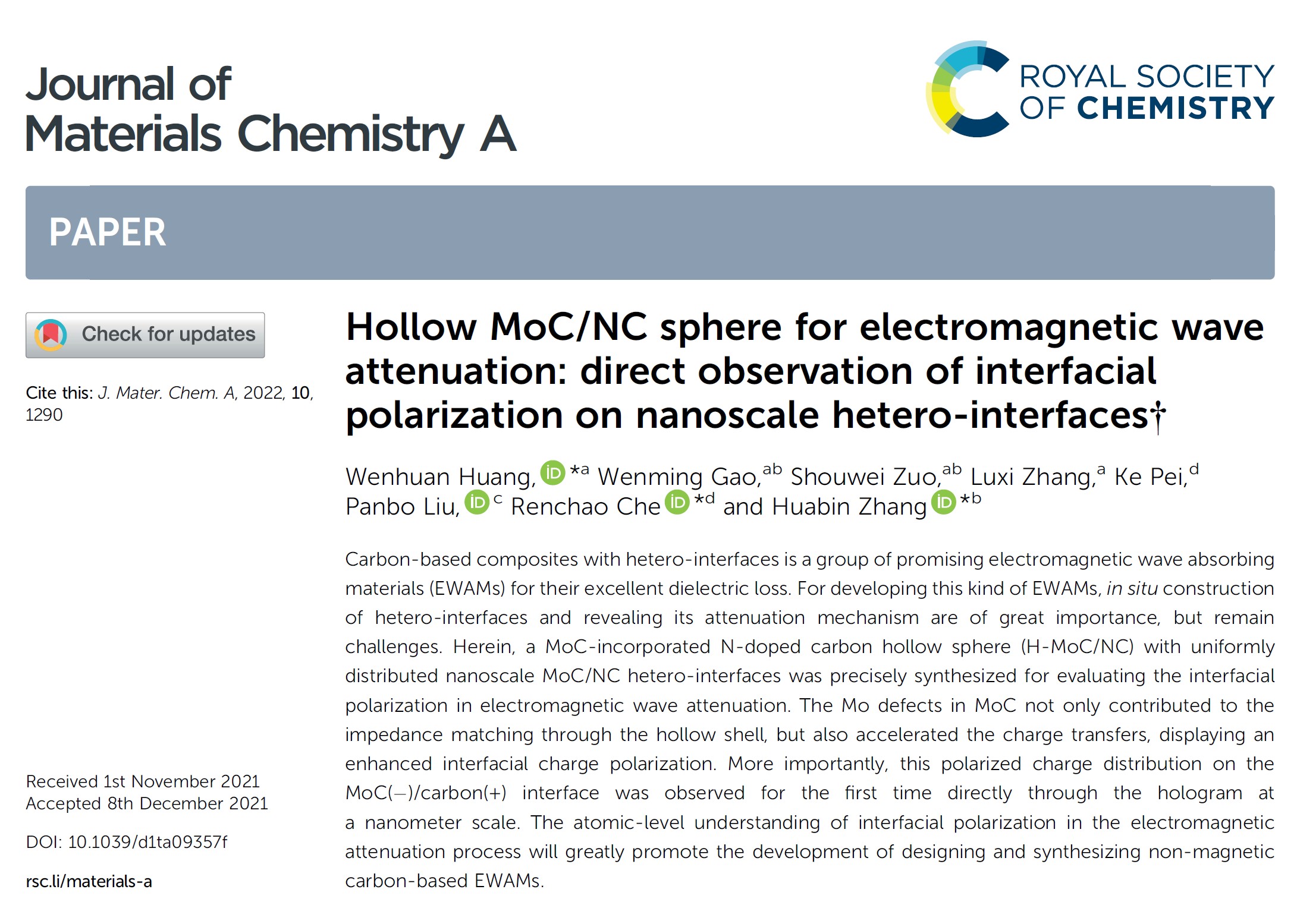 W. Huang*, W. Gao, S. Zuo, L. Zhang, K. Pei, P. Liu and R. Che*, and H. Zhang*, Hollow MoC/NC Sphere for Electromagnetic Wave Attenuation: Direct Observation of Interfacial Polarization on Nanoscale Hetero-interfaces.Journal of Materials Chemistry A,2022, 10: 1290-1298.