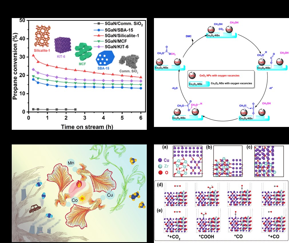 图1 CO2催化转化体系开发:(a)GaN/SiO2催化CO2氧化丙烷脱氢,(b)Ce-NPs/Co-NSs催化CO2和甲醇合成DMC,(c)Co-Cu-Mn三金属光热催化CO2加氢反应和(d)ZrO2/Cu-Cu2O电催化CO2制备乙烯