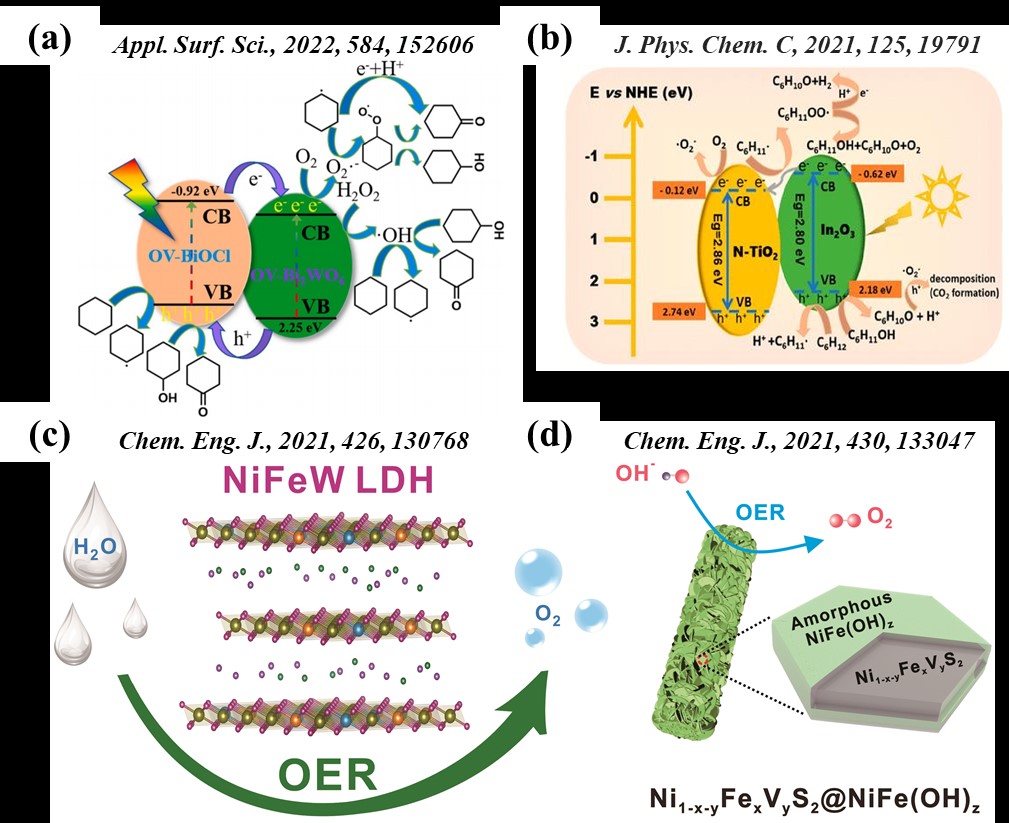 图2 环己烷氧化体系开发:(a)Bi2WO6/BiOCl光催化环己烷氧化制KA油;(b)In2O3/N-TiO2光催化环己烷氧化高选择性制环己酮。电解水体系开发:(c)NiFeW LDH作为OER反应的高效电催化剂;(d)核壳Ni1-x-yFexVyS2@NiFe(OH)z作为OER反应的高效电催化剂