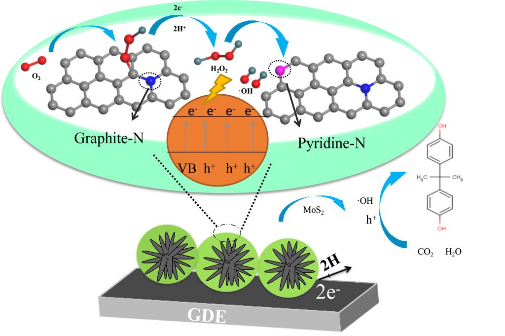 团队研究开发了一种新型光电催化氮掺杂气体扩散电极,通过光生电子提高电催化降解有机污染物的效率,其中电子与空穴及助催化剂相互协助高效合成过氧化氢,进一步产生高活性集团分子促进有机物的降解去除,为光电催化电极的实际应用提供理论支持。通过电沉积苯胺制备选择性吸附降解双功能电催化电极材料,构建高效电化学体系,提高了氧气反应活性及其产物的选择性,对全氟类持久性有机污染物降解性能优化,电化学技术降解全氟化合物提供理论指导。