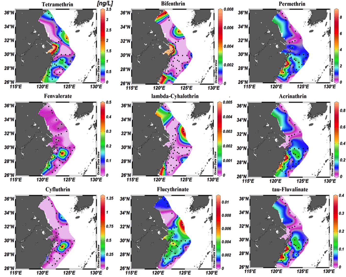 表层海水中九种拟除虫菊酯化合物的空间分布