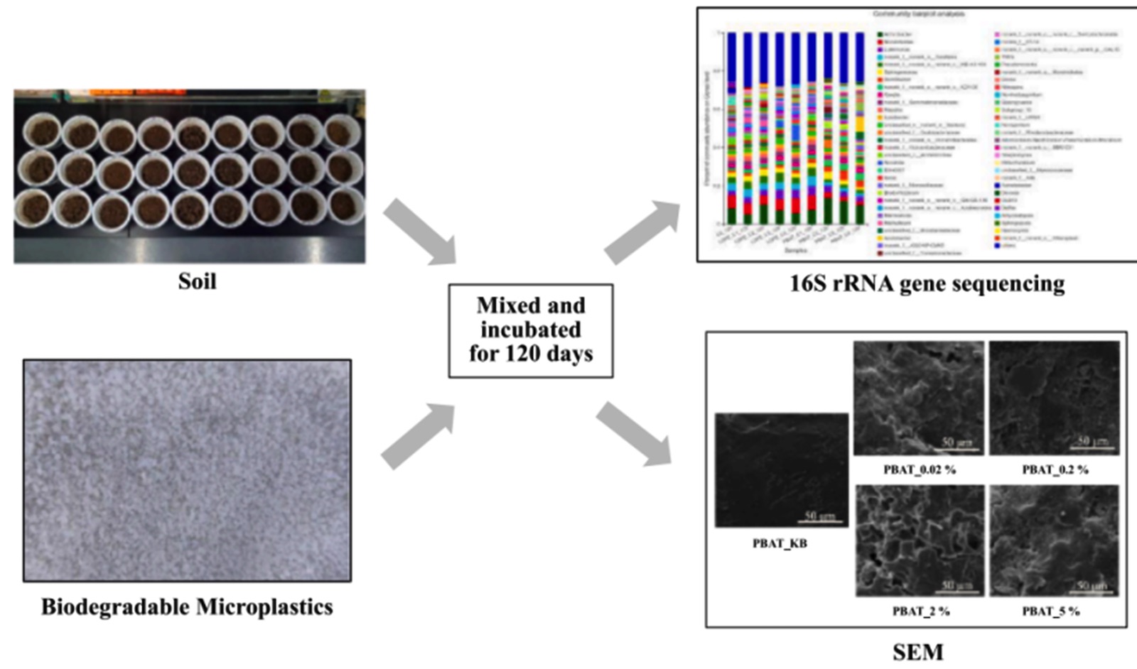 团队李成涛副教授基于高通量测序技术,研究了PBAT微塑料的添加量对土壤微生物菌群结构、多样性及理化性质的影响,进而综合对比分析评价PBAT在生物降解过程中的微塑料效应。发现较低添加量的PBAT微塑料会相对增加土壤细菌群落的多样性,且添加PBAT微塑料土壤的理化性质、细菌群落多样性和组成、结构均受其添加量的影响,不同PBAT添加量土壤中细菌群落丰度与土壤理化性质间存在显著相关性。