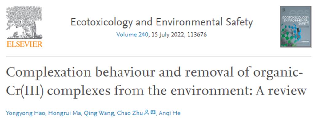 Yongyong Hao, Hongrui Ma, Qing Wang,Chao Zhu*, Anqi He Complexation behaviour and removal of organic-Cr(III) complexes from the environment: A review. Ecotoxicology and Environmental Safety. 2022, 240: 113676.