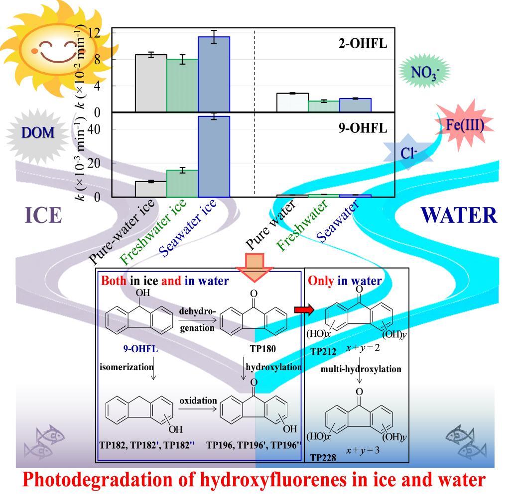 团队葛林科教授比较研究了新污染物羟基多环芳烃OH-PAHs在冰中和水中光化学转化的动力学、主要溶解性物质的影响,以及转化产物和路径,揭示了冰雪环境光化学和水环境光化学的异同,这对于准确评价寒冷环境中此类新型污染物的归趋具有重要意义。